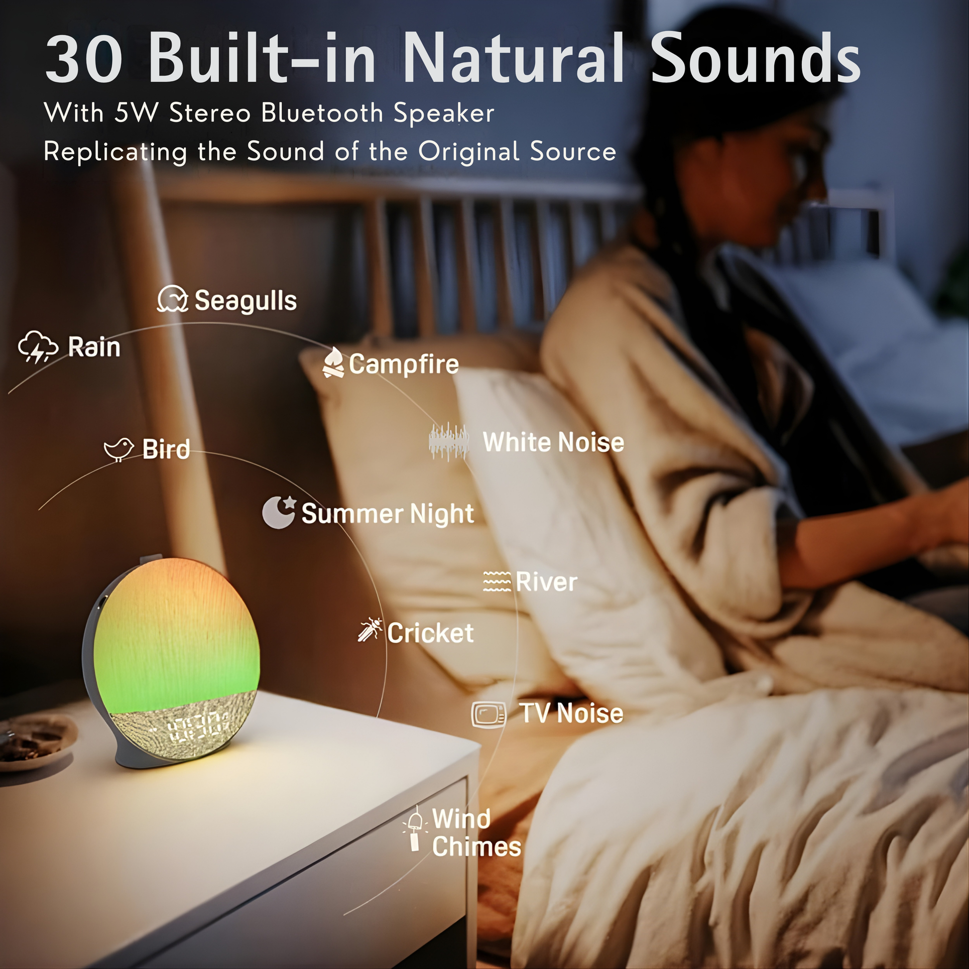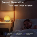 Sunset & Sleep Aid: The "Sunset Mode" gradually dims the light and fades your chosen white noise, guiding you into a deep, effortless slumber.